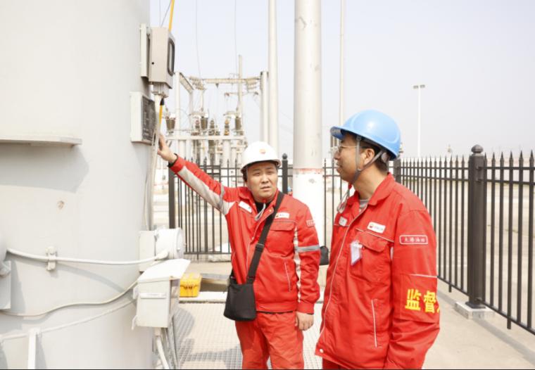 图为采油工们按照标杆紧固赵安2116井井口流程丝堵,防止油气泄露。