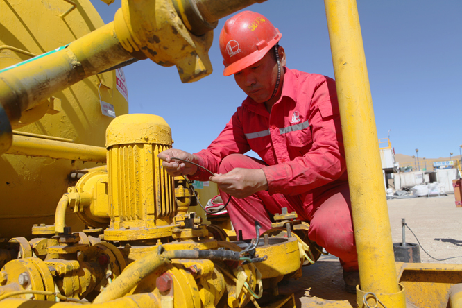 图为该公司内蒙项目部钻井队员工检查现场设备。