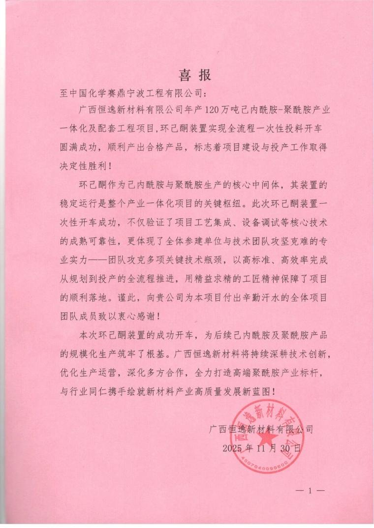 近日,中国化学赛鼎公司所属宁波公司收到广西恒逸新材料有限公司发来的喜报,对公司在年产120万吨己内酰胺-聚酰胺产业一体化及配套工程项目中的卓越表现给予高度肯定,向项目团队的辛勤付出与突出贡献致以诚挚感...